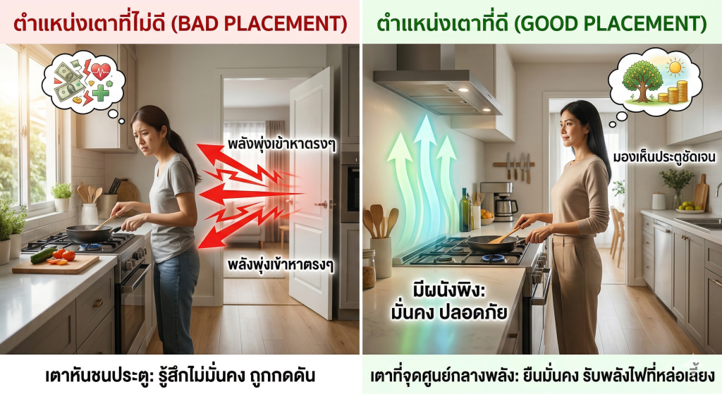 หากต้องเลือกองค์ประกอบที่สำคัญที่สุดในครัว เตาไฟคือสิ่งนั้น เพราะเป็นจุดกำเนิดของพลังไฟที่หล่อเลี้ยงทุกอย่าง เวลาคุณยืนทำอาหาร คุณควรอยู่ในตำแหน่งที่มั่นคง ไม่รู้สึกถูกกดดันหรือถูกรบกวนจากด้านหลัง หากเตาถูกวางหันชนประตูพอดี ทุกครั้งที่คุณทำอาหาร คุณจะรู้สึกเหมือนมีพลังพุ่งเข้าหาโดยตรง ซึ่งในเชิงฮวงจุ้ยถือว่าไม่ดี และในเชิงจิตวิทยาก็ทำให้รู้สึกไม่สบายใจโดยไม่รู้ตัว