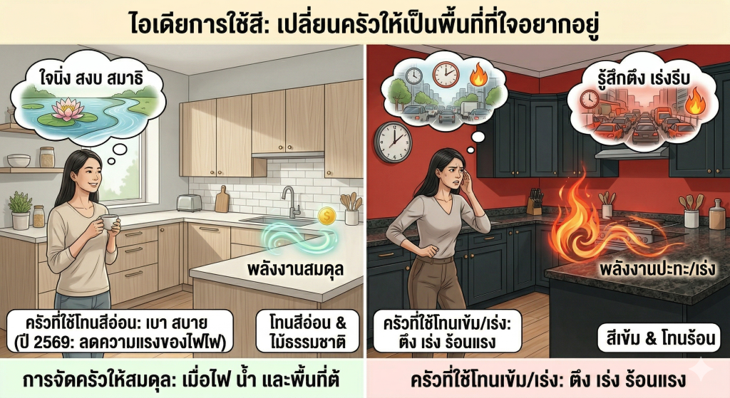 ครัวที่ใช้โทนสีอ่อน เช่น สีขาว ครีม หรือเทาอ่อน ผสมกับวัสดุลายไม้ธรรมชาติ จะให้ความรู้สึกโล่ง เบา และสบายตา ต่างจากครัวที่ใช้สีแดง ส้ม หรือโทนเข้มจัดเป็นหลัก ซึ่งแม้จะดูโดดเด่น แต่เมื่อใช้งานจริงจะให้ความรู้สึกตึงและเร่ง