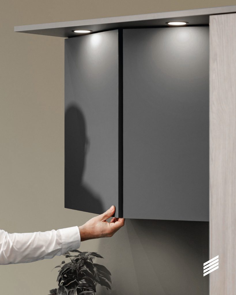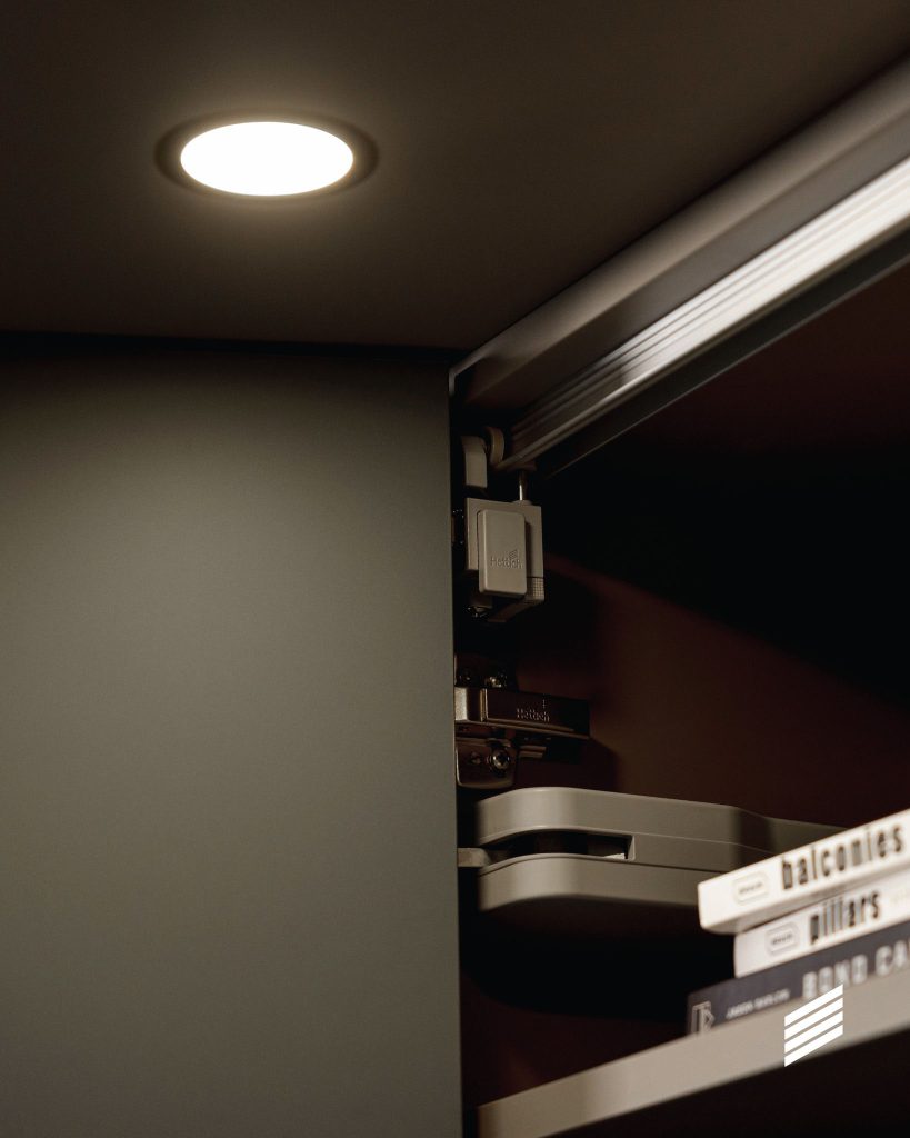 - Push to Move สำหรับหน้าบานไร้มือจับ เพียงกดเบาๆ ที่หน้าบาน บานจะเปิดออกอัตโนมัติ และเมื่อปิด กลไกจะช่วยดึงบานกลับเข้าตำแหน่งเดิมอย่างนุ่มนวล พร้อมตัวเลือกเสริม Stay Closed Mechanism สำหรับล็อกให้บานปิดแน่น