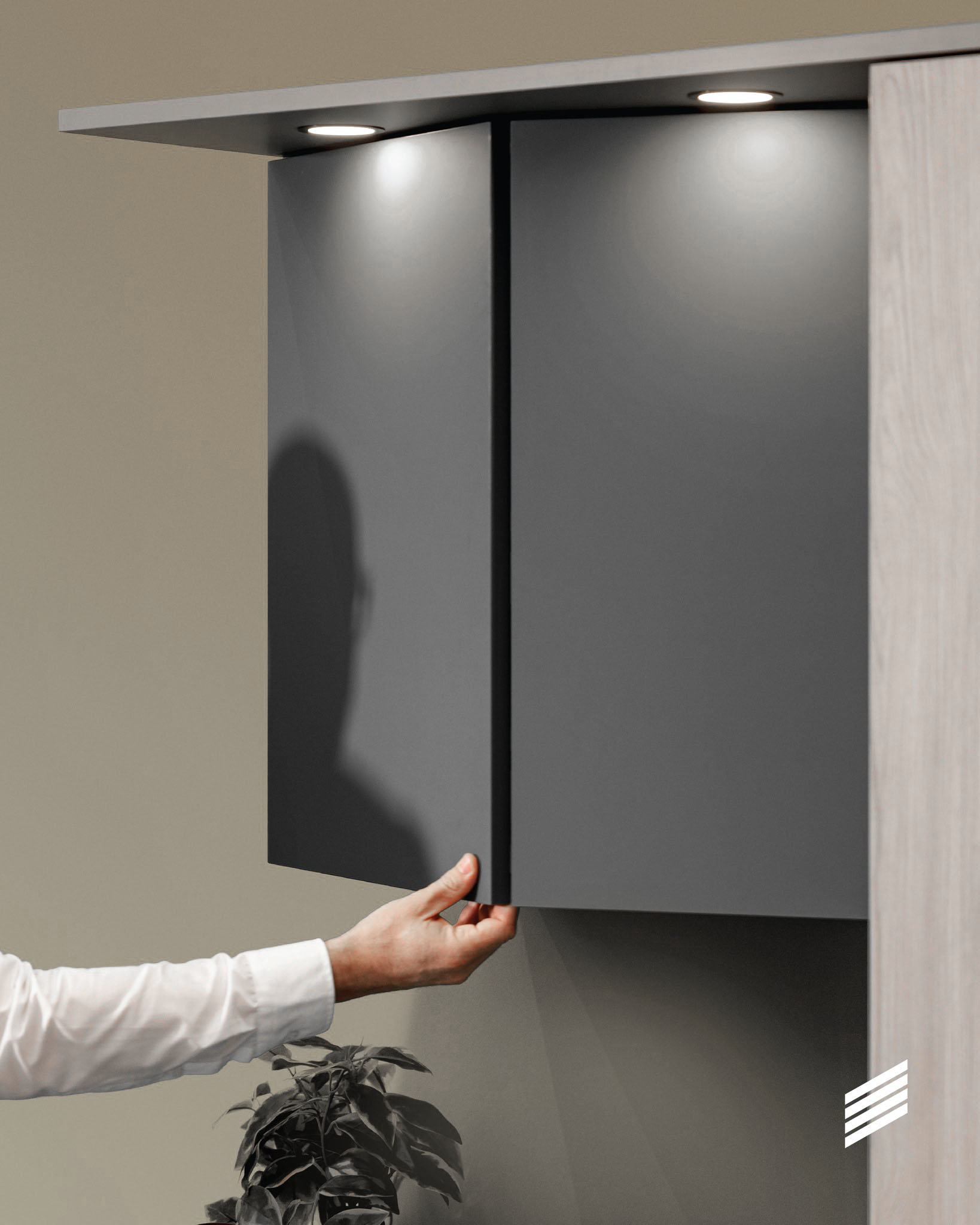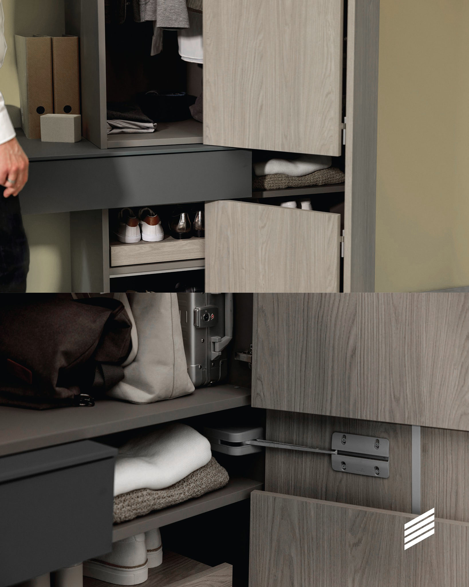 - Push to Move สำหรับหน้าบานไร้มือจับ เพียงกดเบาๆ ที่หน้าบาน บานจะเปิดออกอัตโนมัติ และเมื่อปิด กลไกจะช่วยดึงบานกลับเข้าตำแหน่งเดิมอย่างนุ่มนวล พร้อมตัวเลือกเสริม Stay Closed Mechanism สำหรับล็อกให้บานปิดแน่น