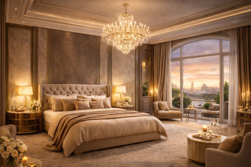 ห้องนอนใหญ่ของบ้านหรูเป็นพื้นที่ ที่สะท้อนความเป็นส่วนตัว และการพักผ่อนที่แท้จริง การออกแบบมักเลือกใช้สีโทนอบอุ่นหรู เช่นเทาเข้ม น้ำตาลทอง หรือครีม ขึ้นอยู่กับสไตล์ของเจ้าของบ้าน เฟอร์นิเจอร์ควรมีทั้งฟังก์ชันและความสวยงาม เช่น เตียงขนาด King Size หัวเตียงบุผ้านุ่ม ใส่ลูกเล่นการออกแบบด้วยคิ้วอลูมิเนียม ตู้ข้างเตียงหินอ่อน โซฟานั่งเล่นเล็กๆ และงานศิลป์ที่ช่วยเติมเต็มอารมณ์