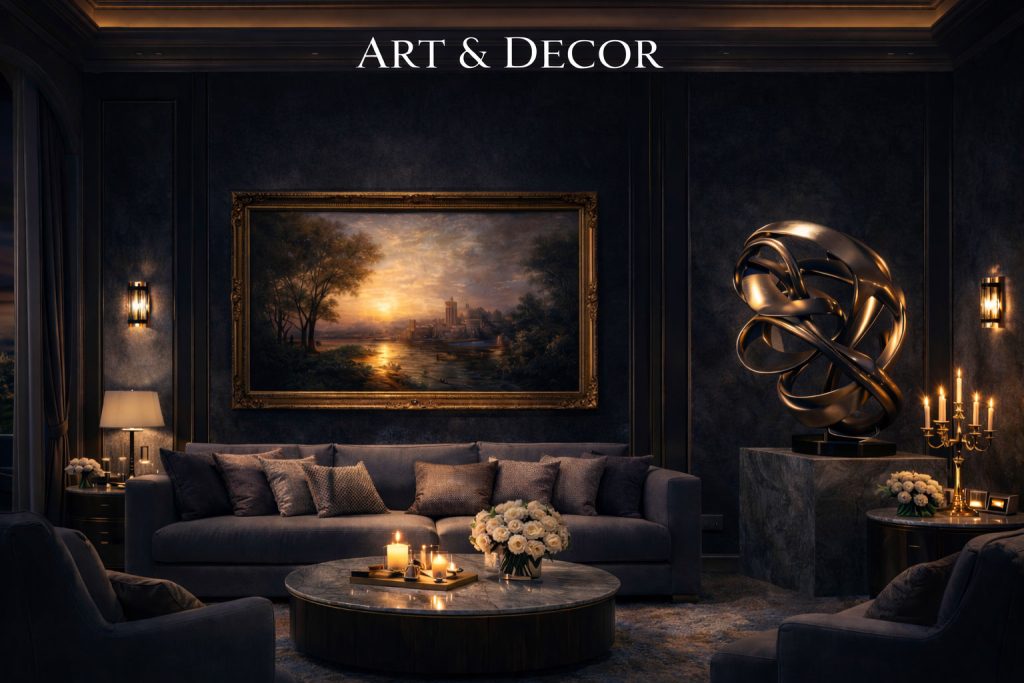 - งานศิลปะและของตกแต่ง (Art & Decor) แทนที่จะตกแต่งด้วยของชิ้นเล็กจำนวนมาก บ้าน Luxury จะเลือกงานศิลป์ชิ้นใหญ่แต่มีคุณค่า ไม่ว่าจะเป็นภาพวาดสีน้ำมันที่มีเอกลักษณ์ ประติมากรรมโลหะสมัยใหม่ หรือแจกันคริสตัลที่จัดวางบนโต๊ะคอนโซลในโถงทางเข้า การแขวนภาพ Abstract ขนาดใหญ่ไว้เหนือโซฟาในห้องนั่งเล่นจะช่วยสร้างโฟกัสให้ห้องดูมีมิติและสะท้อนรสนิยมเจ้าของบ้านโดยตรง