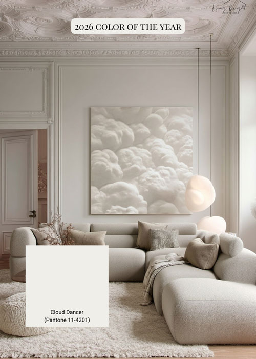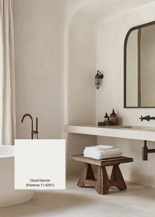 Cloud Dancer จะสวยที่สุดเมื่อมีการเล่นกับเลเยอร์และพื้นผิว จะทำให้สีขาวนี้มีมิติ ไม่เรียบ และไม่จืดสิ่งสำคัญของการใช้สีนี้คือการเข้าใจการสร้างมิติผ่าน :