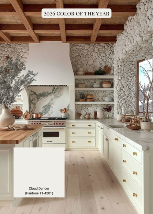 ในพื้นที่ครัว Cloud Dancer ให้ภาพลักษณ์ที่สะอาดแต่ไม่แข็ง ต่างจากสีขาวสว่างจัดที่อาจดูเป็นเชิงพาณิชย์ เหมาะกับครัวบ้าน ครัวเปิด พื้นที่ทานอาหารที่เชื่อมกับห้องนั่งเล่น เมื่อใช้ร่วมกับไฟโทนอุ่นจะให้ความรู้สึกอบอุ่น เป็นกันเอง และใช้งานได้จริง